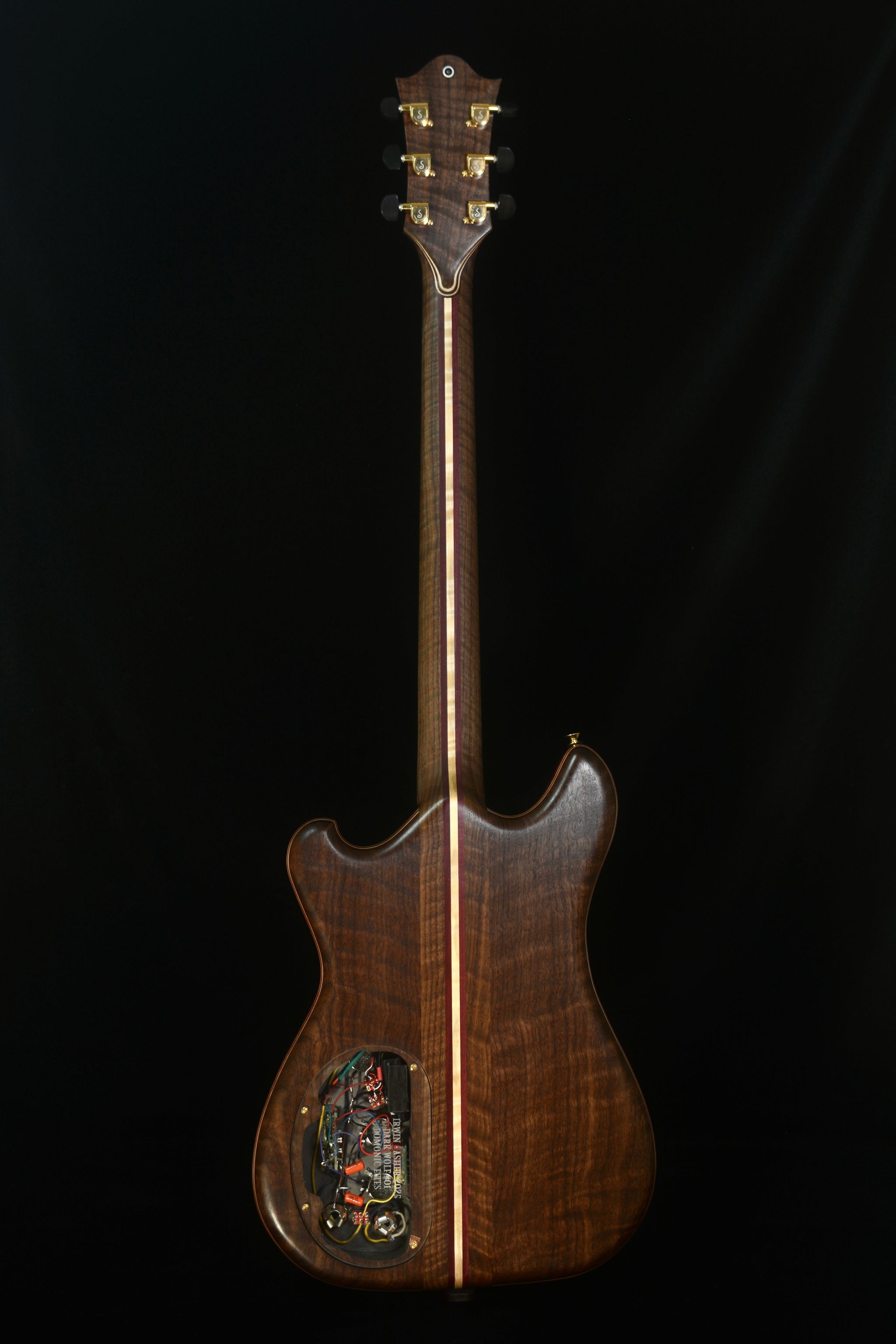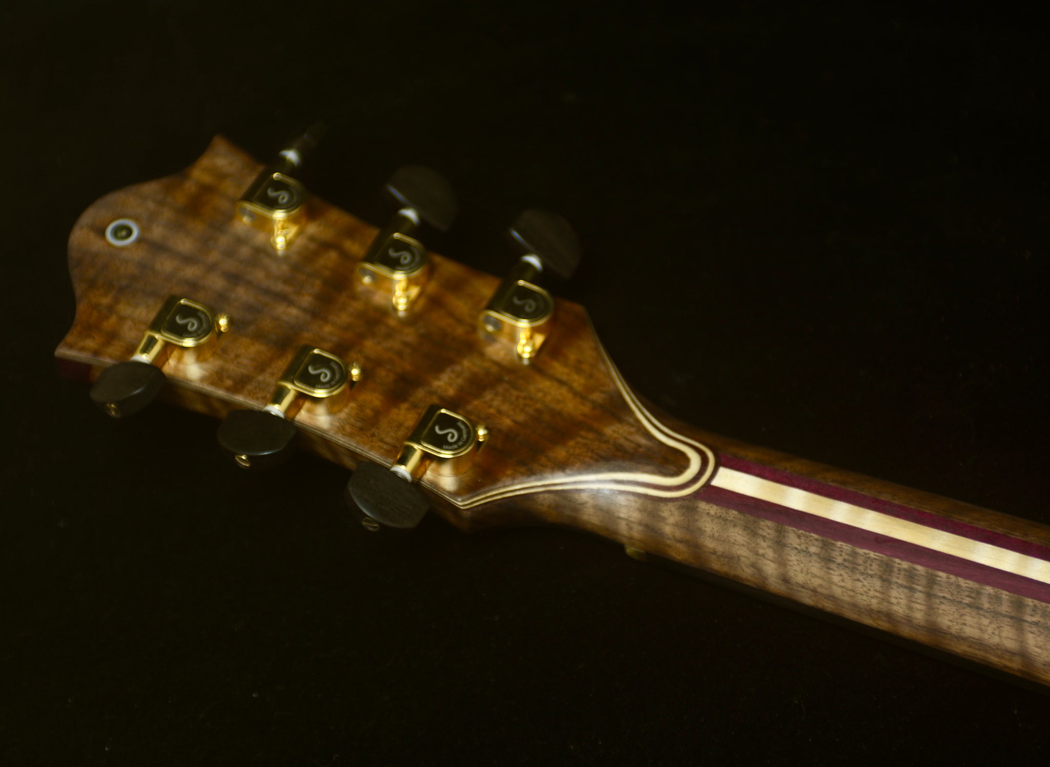 - neck ~ 5-layer lamination of purple heart and fiddleback maple with sterling silver side dots